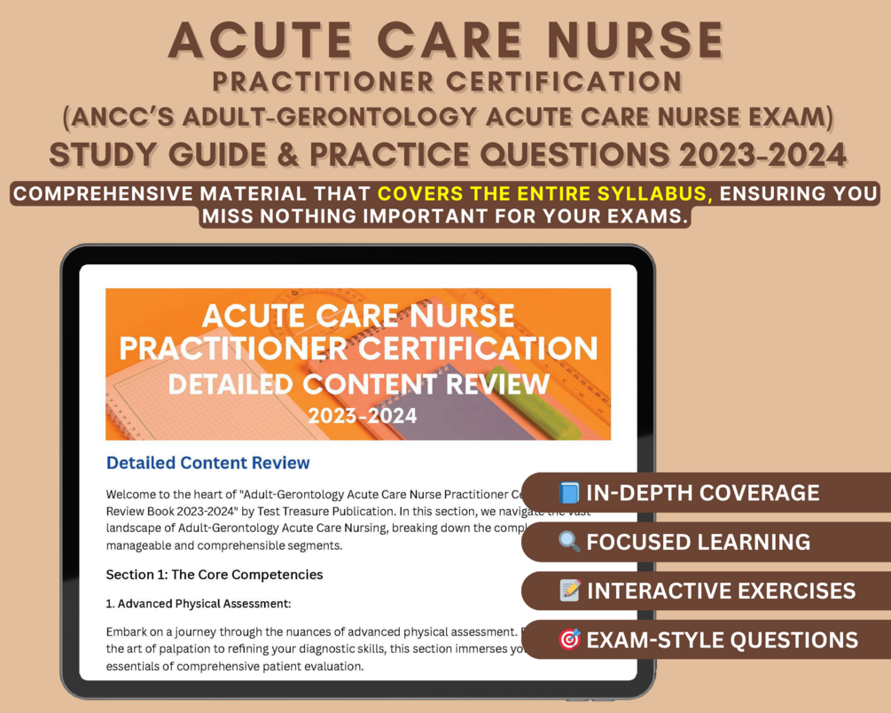 📘 Embark on a comprehensive journey towards acing the Adult-Gerontology Acute Care Nurse Practitioner Certification Exam with our meticulously crafted guide. This study companion is your key to mastering the core competencies, clinical practice, and professional role essential for success in the 2023-2024 certification.