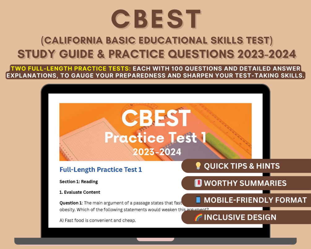 📚 Embark on your journey to ace the California Basic Educational Skills Test (CBEST) with our meticulously crafted study guide. At Test Treasure Publication, we've curated the ultimate resource to propel you towards success in the 2023-2024 CBEST exam.