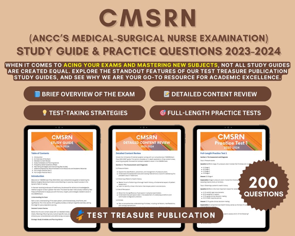 π©ββοΈ Are you ready to conquer the Certified Medical-Surgical Registered Nurse (CMSRN) Exam? Look no further! Introducing "CMSRN Exam Prep 2023-2024" by Test Treasure Publicationβyour ultimate guide to mastering the exam and unlocking a world of nursing possibilities.