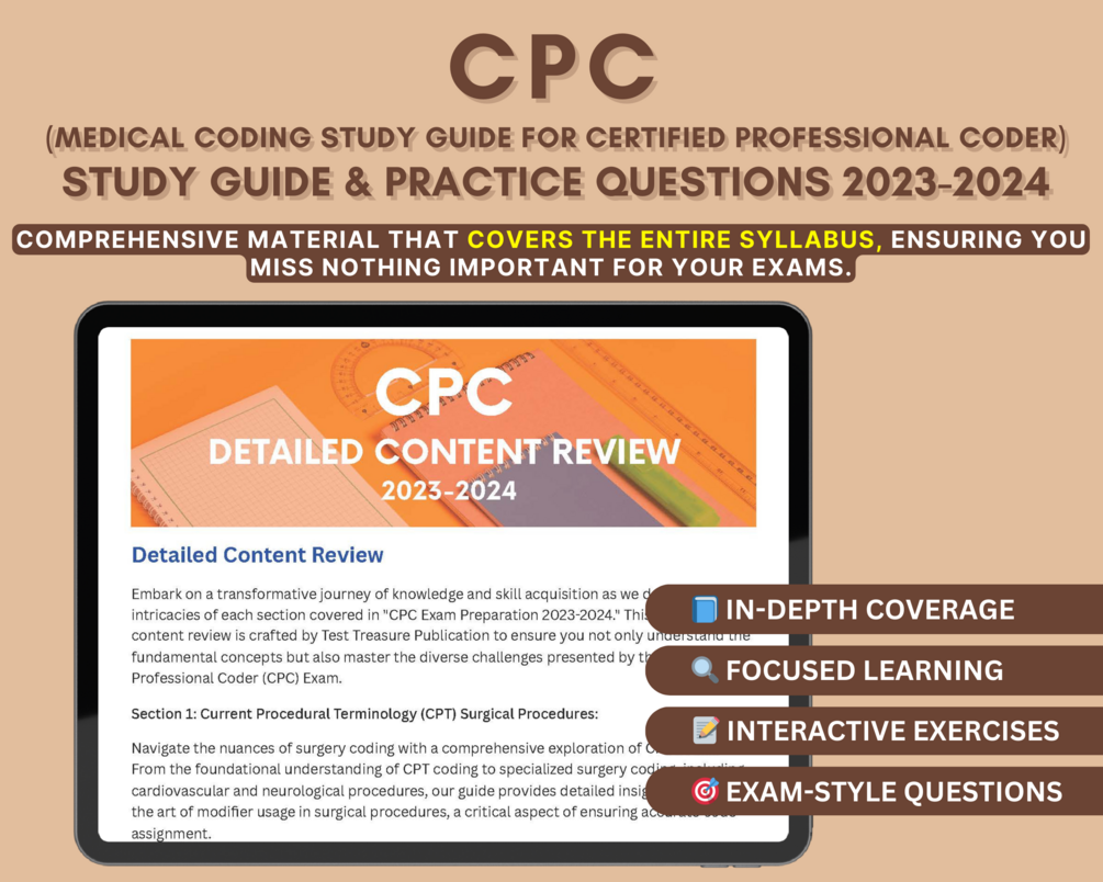 Master the intricacies of medical coding and elevate your career with our "CPC Exam Preparation 2023-2024" study guide, proudly presented by Test Treasure Publication!
