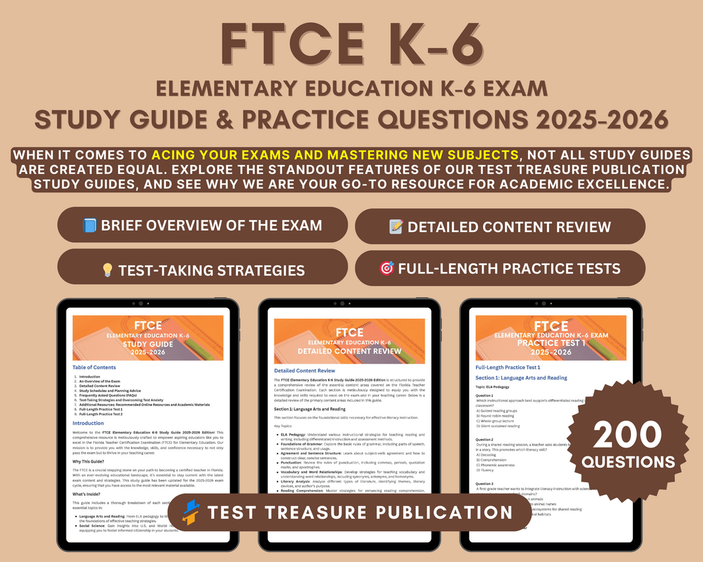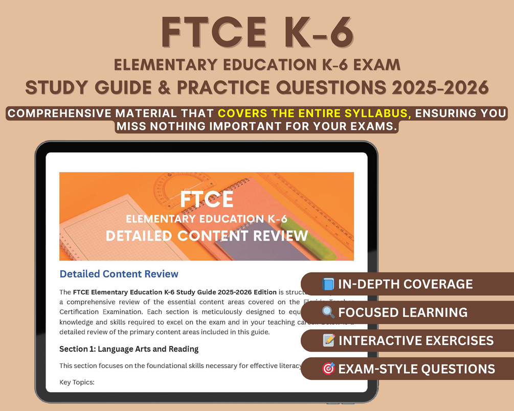 🌟 Set Yourself Up for Success in the FTCE Elementary Education K-6 Exam with our 2025-2026 study guide. Elevate your chances of achieving your dream career in teaching!