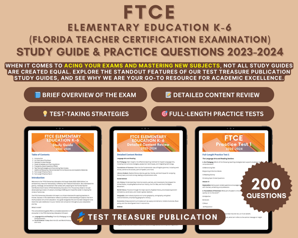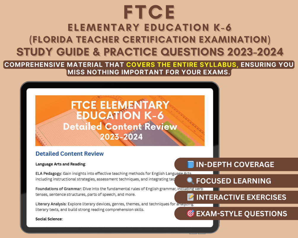 🌟 Set Yourself Up for Success in the FTCE Elementary Education K-6 Exam with our 2023-2024 study guide. Elevate your chances of achieving your dream career in teaching!