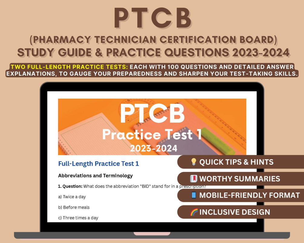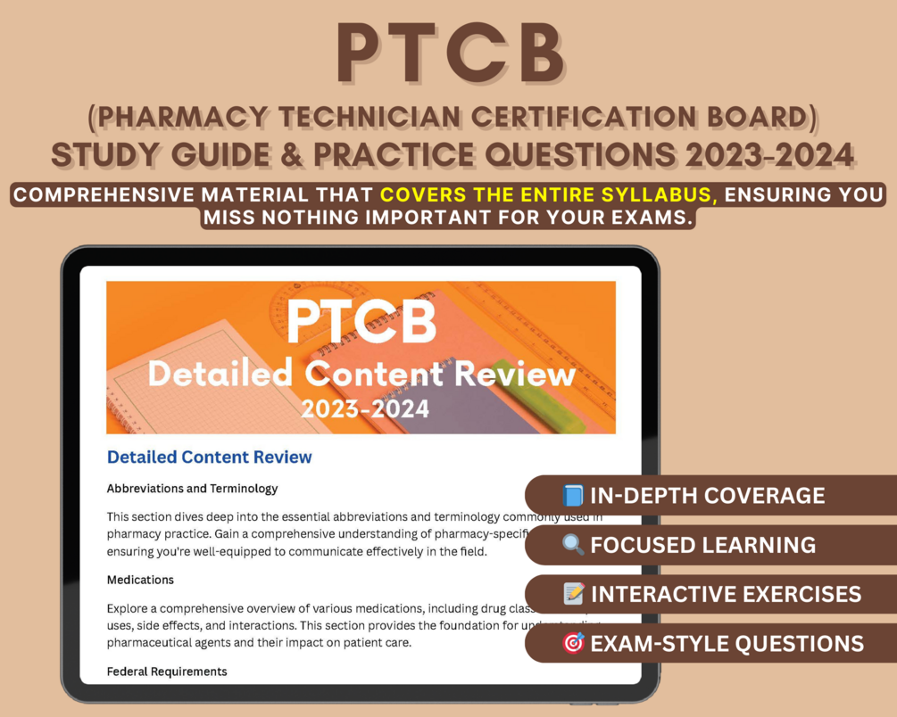 π Prepare for success in the ever-evolving field of pharmacy with our cutting-edge study guide tailored for the 2023β2024 PTCB Exam. This comprehensive resource is crafted to empower aspiring pharmacy technicians, providing a roadmap to conquer the exam and embark on a rewarding career in healthcare.